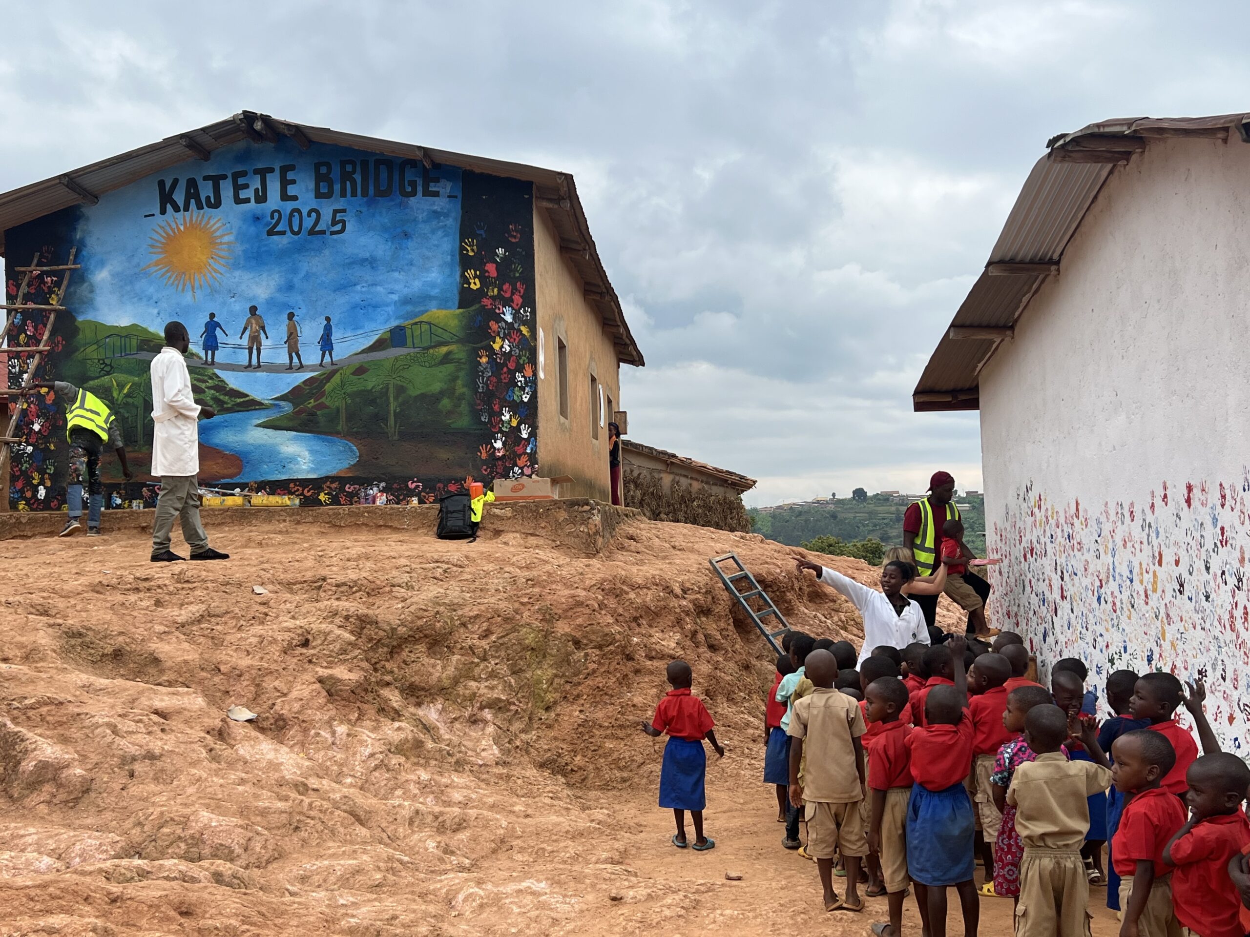 As part of the project’s broader impact, Nadya led a community engagement initiative at Indashyikirwa za Busekera, the school closest to the bridge site. Partnering with Kigali-based artist Manzi Pascal of Imazi Arts Space and his colleague Kayiranga Shadrack, the team co-created a large-scale mural with local students. The artwork commemorates the new bridge and symbolises the opportunities it unlocks for the community. Every student was invited to contribute a handprint to the mural and so many participated, a second wall was needed to include them all!