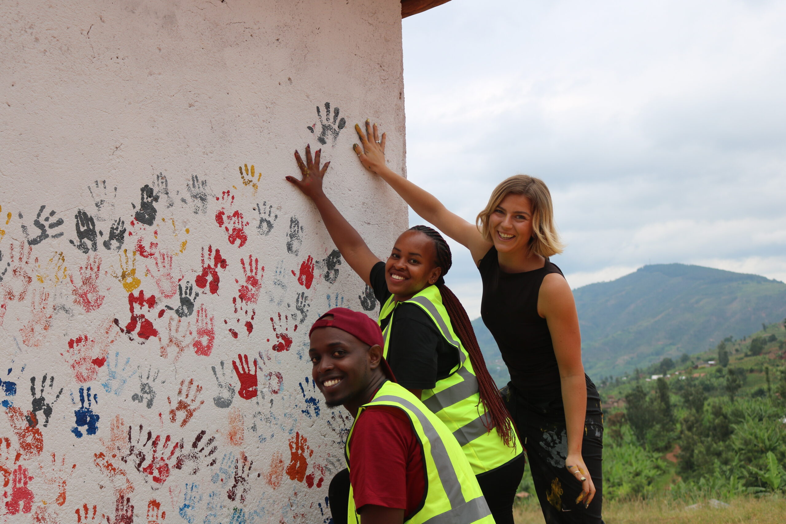 As part of the project’s broader impact, Nadya led a community engagement initiative at Indashyikirwa za Busekera, the school closest to the bridge site. Partnering with Kigali-based artist Manzi Pascal of Imazi Arts Space and his colleague Kayiranga Shadrack, the team co-created a large-scale mural with local students. The artwork commemorates the new bridge and symbolises the opportunities it unlocks for the community. Every student was invited to contribute a handprint to the mural and so many participated, a second wall was needed to include them all!